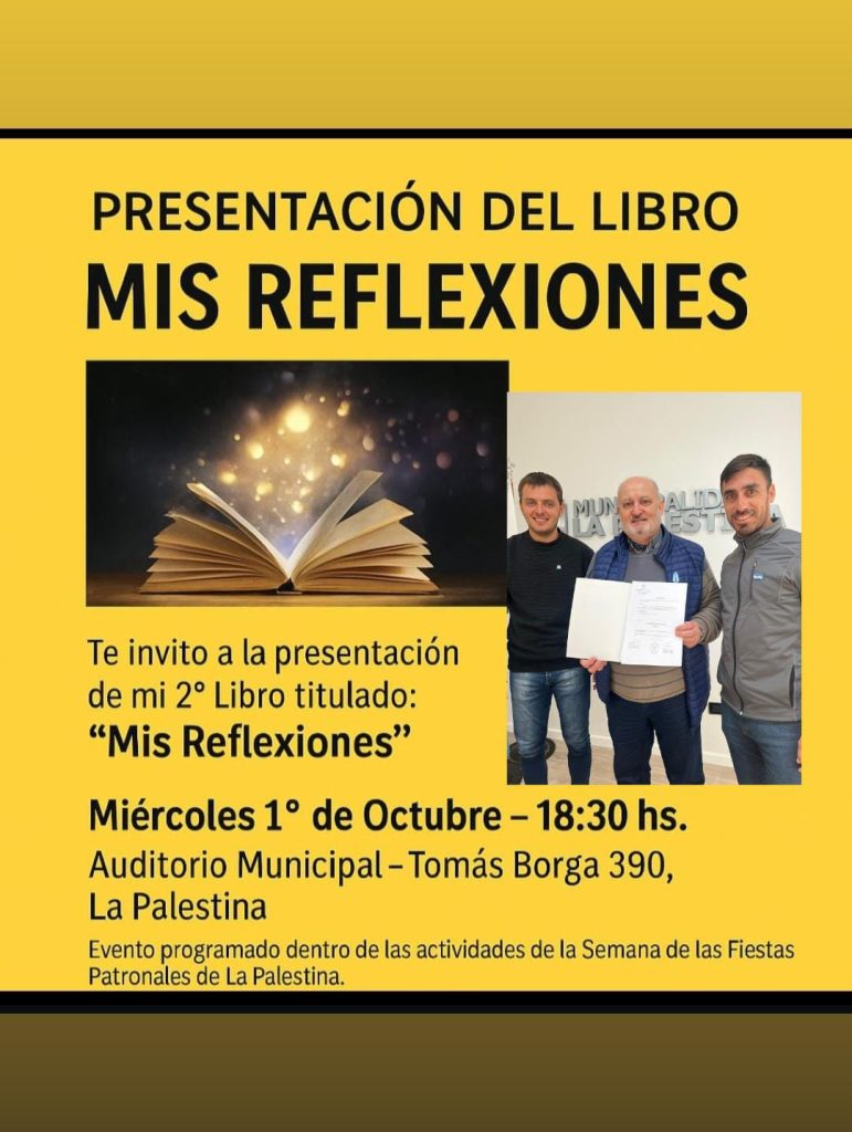La Municipalidad de La Palestina declaró a “Mis Reflexiones” de Interés Municipal y Cultural por la Ordenanza N° 007/2025, aprobada por el Concejo Deliberante, y en esa ocasión, Roberto Cativelli expresaba sobre la segunda edición: “Se trata de diálogos de los pasajes que tiene la vida; nuestras historias humanas, reales, imaginarias…, y también, sobre la historia Argentina reciente”