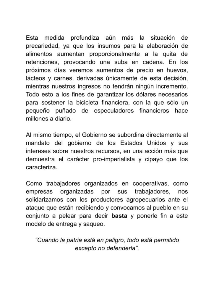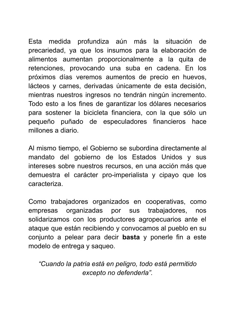 Notas Recibidas por las Cooperativas de Trabajo del Sur de Córdoba en repudio por ganacia extraordinaria a las grandes exportadoras.